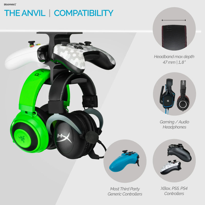 Hang all your controllers and headphones neatly and conveniently out of the way, preventing damage and keeping your game-space clutter free and organized.